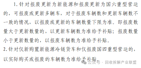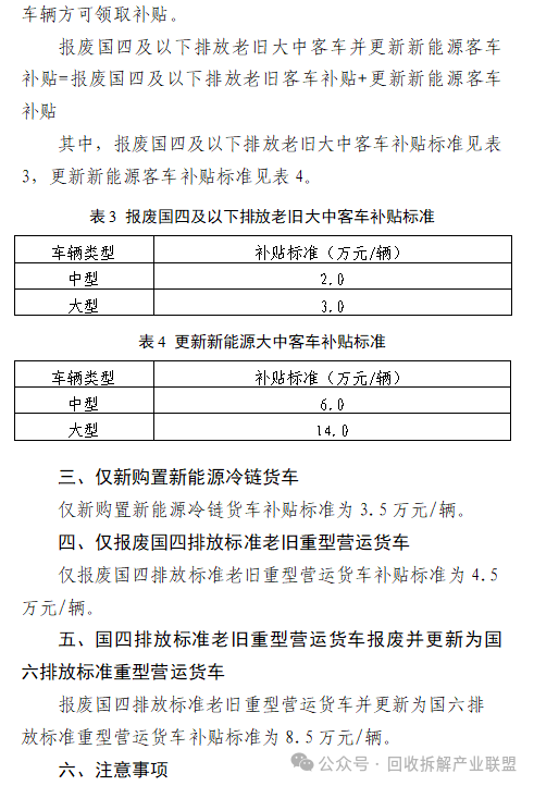 本實施細則對國四及以下排放標(biāo)準老舊貨車和大中型客車報廢并更新為新能源車輛(以下簡稱“報廢更新為新能源”)的車主,僅新購置新能源冷鏈貨車、僅報廢國四排放標(biāo)準老舊重型營運貨車(以下簡稱“僅報廢國四重型營運”)、國四排放標(biāo)準老舊重型營運貨車報廢并更新為國六排放標(biāo)準重型營運貨車(以下簡稱“報廢更新為國六重型營運”)的業(yè)戶給予補貼。